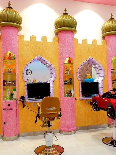 Our salons are designed to provide a unique and memorable customer experience. Each branch features a castle-inspired interior, kid-friendly ergonomics, and themed styling stations equipped with individual flat screens offering on-demand entertainment. This distinct environment ensures that every child feels comfortable, entertained, and valued during their visit.